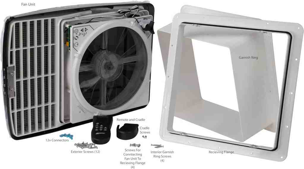- MODEL 1200 – This lightweight, compact, and durable vent fan seals tight when not in use. Powerful 12 in, 10-blade fan quickly moves air in and out of cabin.