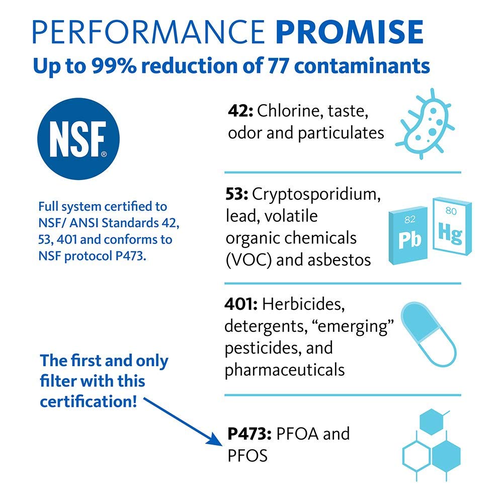 - Removes up to 99% of 77 contaminants including lead, mercury, pesticides, pharmaceuticals, and more