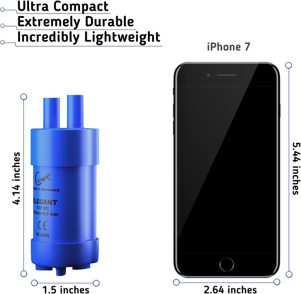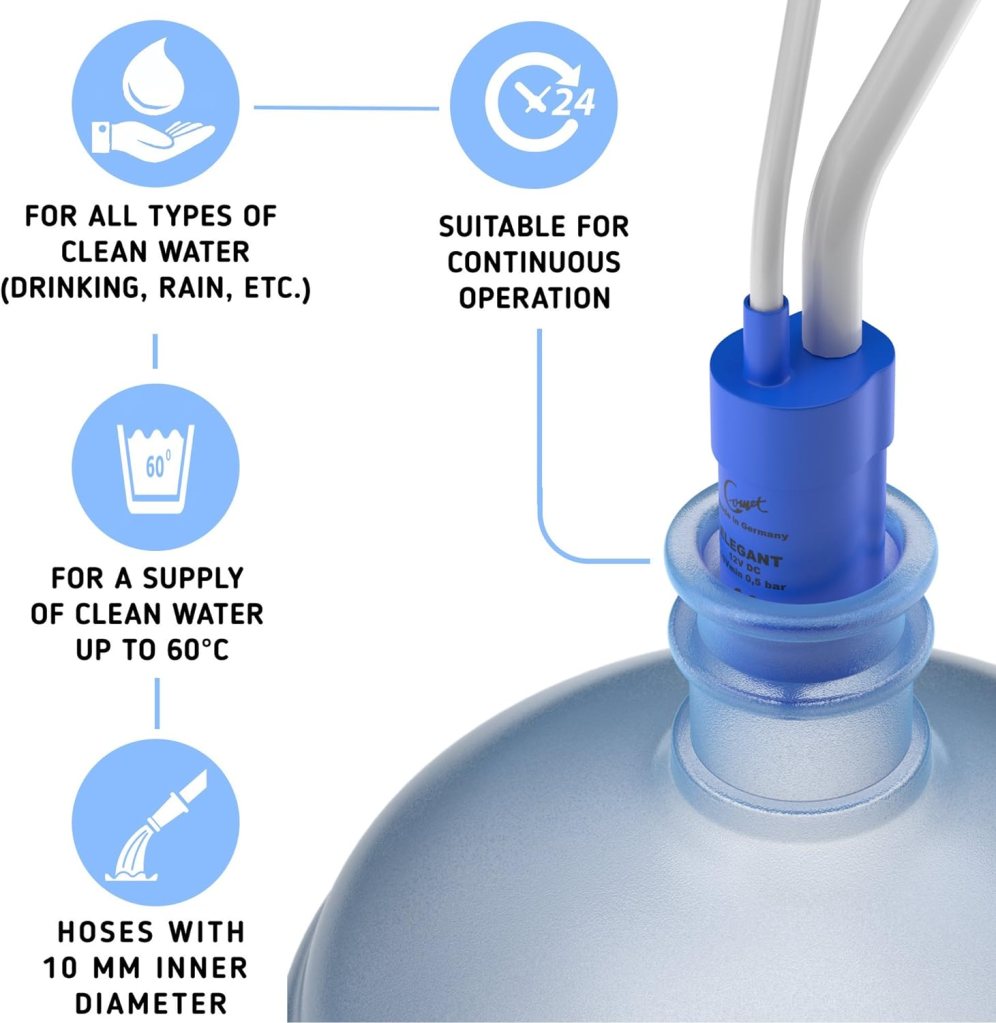 - ✅COMPACT AND QUIET – Product has a really miniature size (4.14 x 1.29 x 1.49 inches) and is lightweight (4.86 oz.) You can connect any 10mm. (3/8″) food grade hose to the suction side. Has enough pressure to be used for the gardening, irrigation, or aquarium purposes. Throughput rate is max. 10 L/min (2,5 GPM) and water delivery up to 5m.(18 feet). Comes with a 1m./39 in. cord.