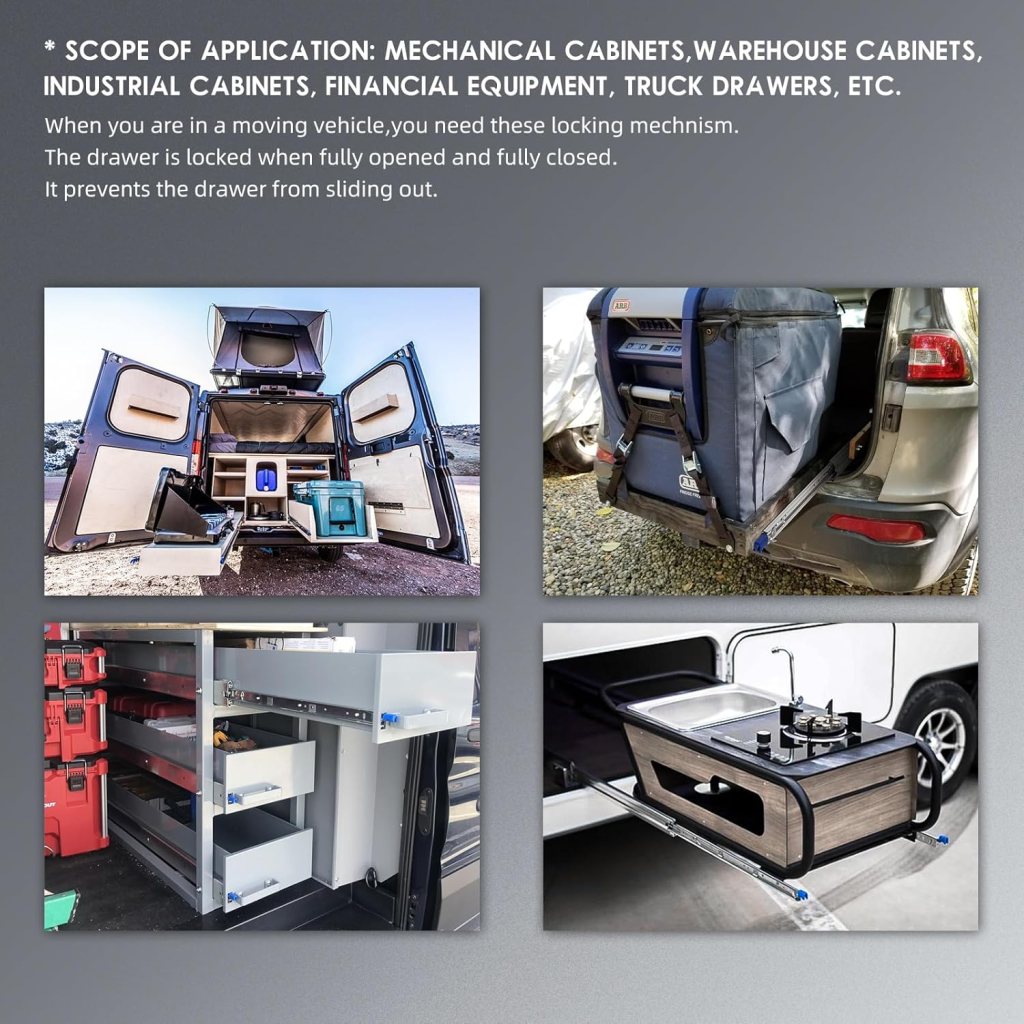 Heavy-duty drawer slides often come with locking mechanisms to keep the slide securely closed when not in use. This is especially important for projects like slide-out galley kitchens or slide-out refrigerator freezers in a camper van, where the contents need to stay in place during travel or rough terrain. Locking mechanisms ensure that the contents of the slide-out do not shift, spill, or become damaged while driving.
