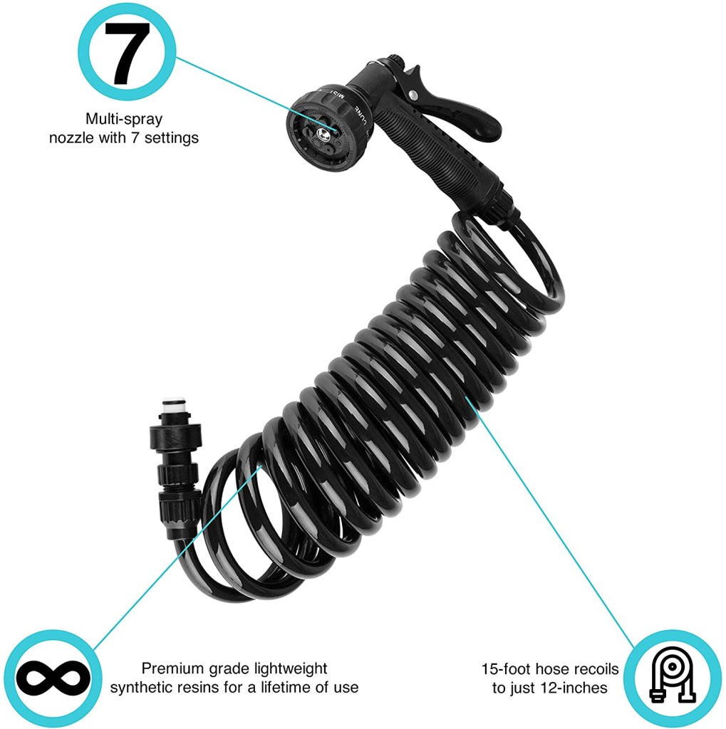 - FEATURES | This sprayer has an ultra-tight seal,15-foot coiled hose, and features a range of settings including shower, 1-in-2, jet, soaker, flat, mist and cone. The spray dock features an easy-to-open face for quick external access.