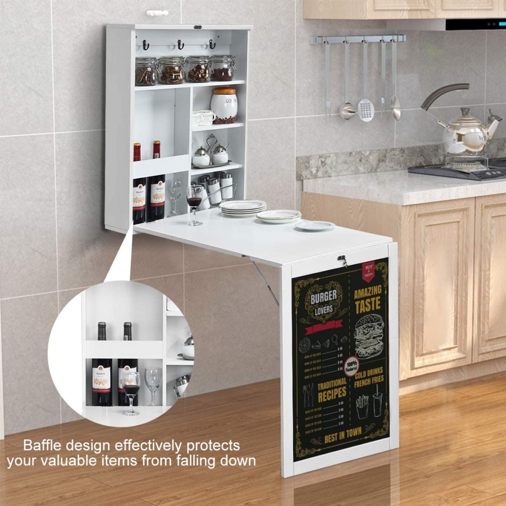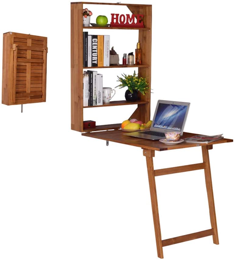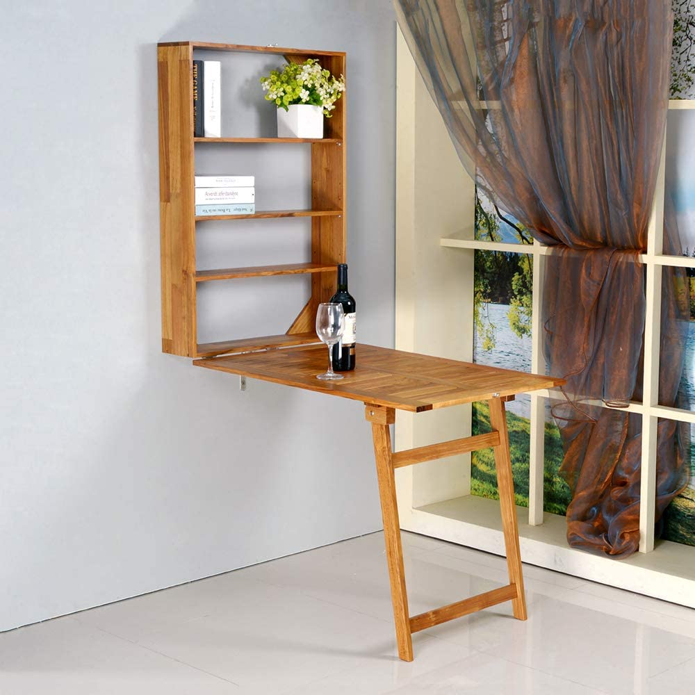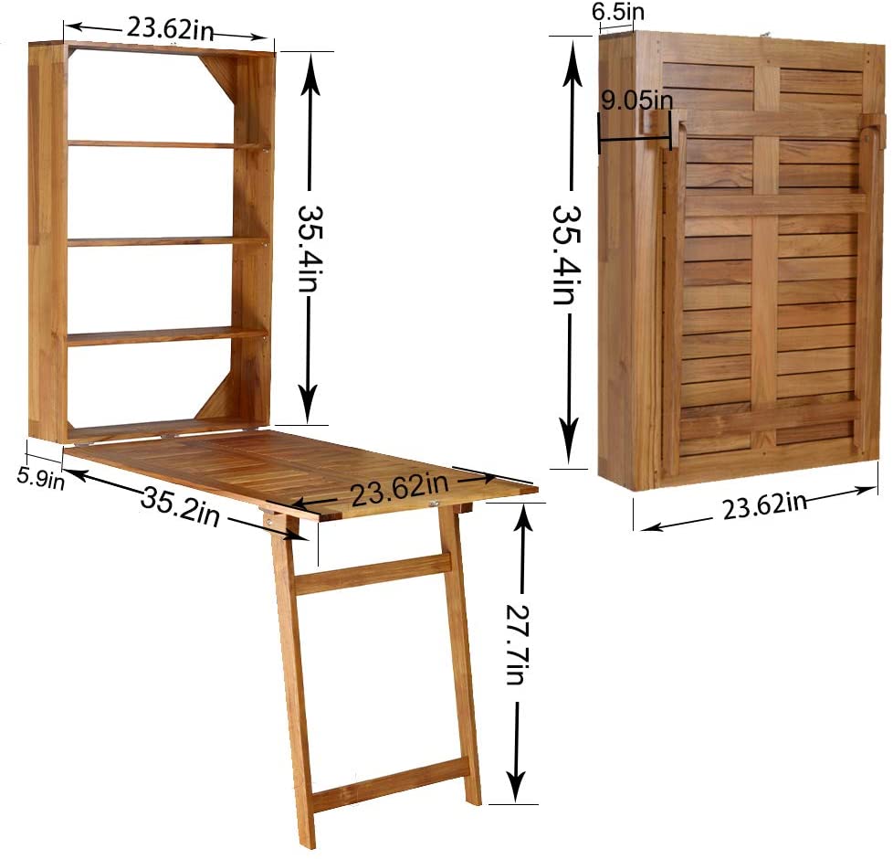 - SPACE SAVING DESIGN–The wall-mounted drop-leaf table has sufficient storage without taking up much room and folds away neatly to save space when not in use.The foldable wall desk opens up to reveal a pull-down desk with hinged legs,Inside, and it features 3 adjustable shelves.