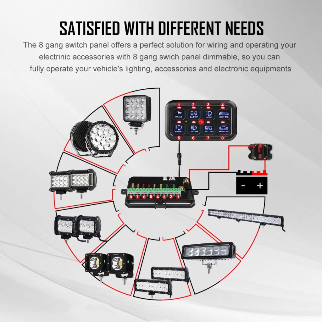 - Wide Application: Taking limited space on some vehicles into account, this more compact size switch panel control system is perfect for all situations. Auxbeam 8 In 1 touch screen panel more suitable for your needs, such as truck, boat, off road, powersport, marine, atv, utv, suv, car, bus, heavy duty etc