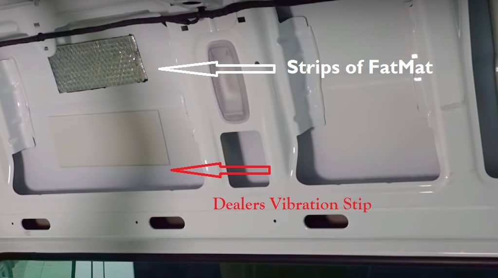 Soundproofing a van camper starts by adding small strips of FatMat Self-Adhesive Rattletrap to the uncovered metal shin panels in the cargo area. These open thin squares of metal between the metal frame work is were the reverberations come from. Adding a small strip of this FatMat dapens the metal sound.