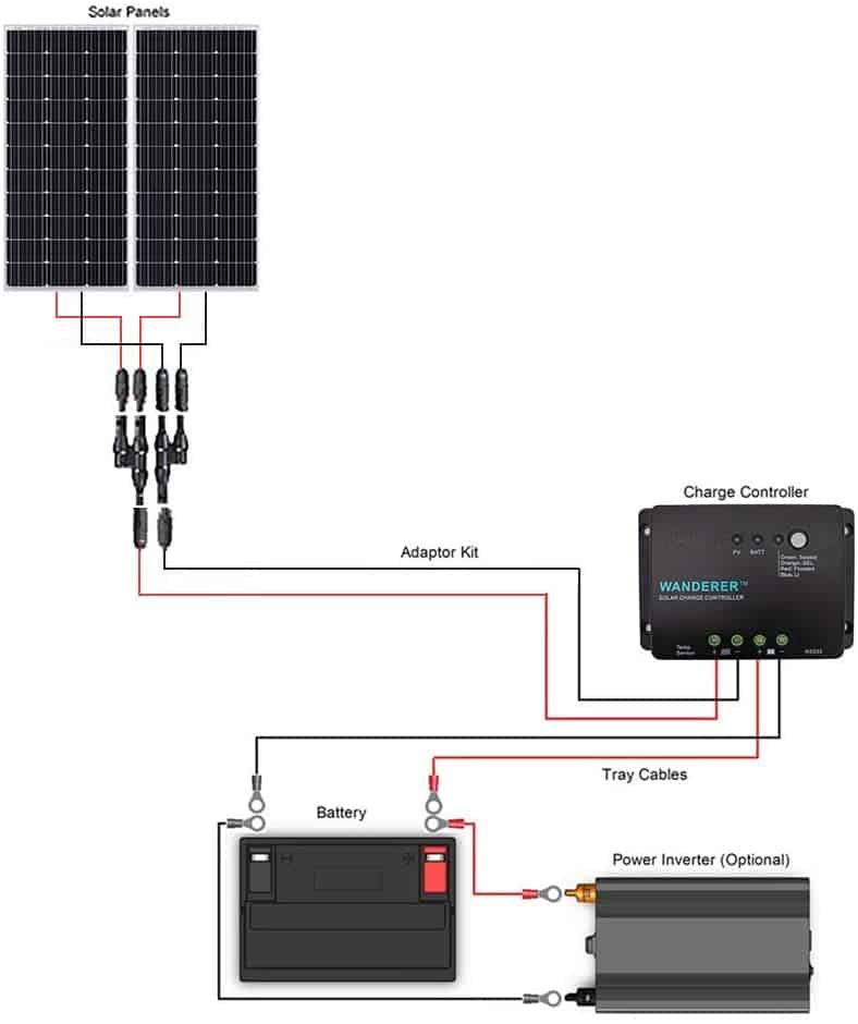 This solar kit conveniently includes the tools necessary for a new system: two Renogy 100W 12V Mono Solar Panels, one 30A PWM Wanderer Li Charge Controller, one 20ft 10AWG Solar Adaptor Kit, one 8ft 10AWG Tray Cable, one pair of branch connectors, and two sets of Z-brackets. Travel with ease and comfort with a Renogy solar Starter Kit.