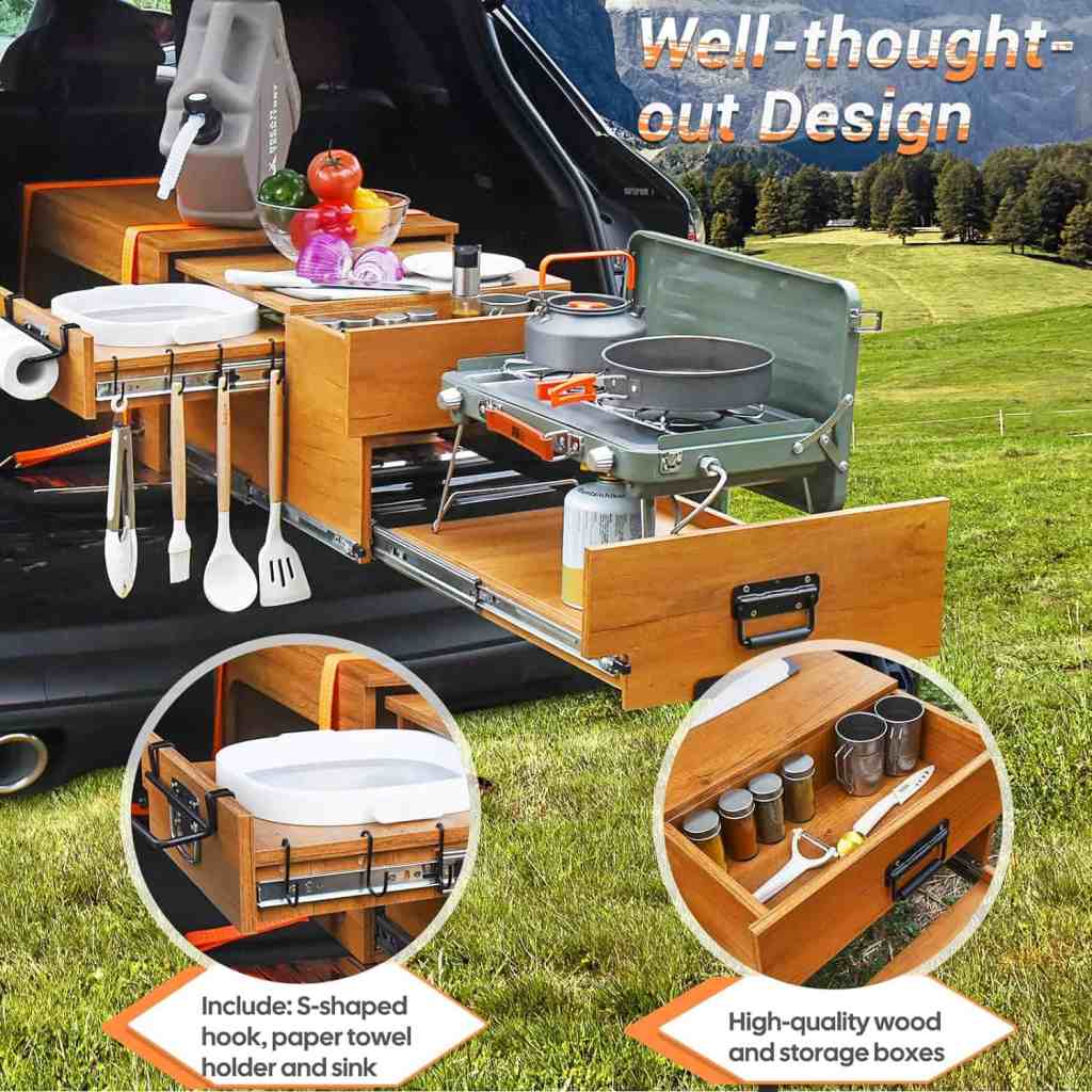 GADFISH Overland Camp Kitchen, Vehicle Camping Table for Burners Camp Stove, Outdoor Portable Folding Kitchen Box with Bed Drawer Ideal for SUV/Truck/RV/Van