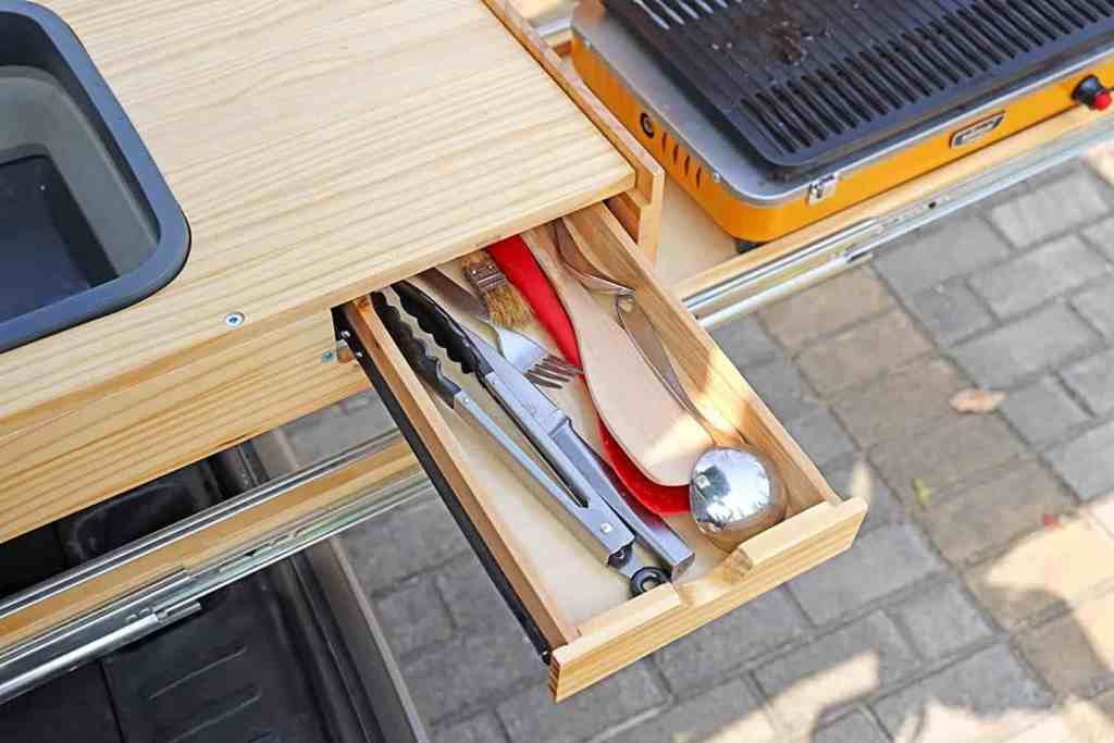 This slide out kitchen can hold a water tank for cleaning your dishes in a collapsible dish tub.