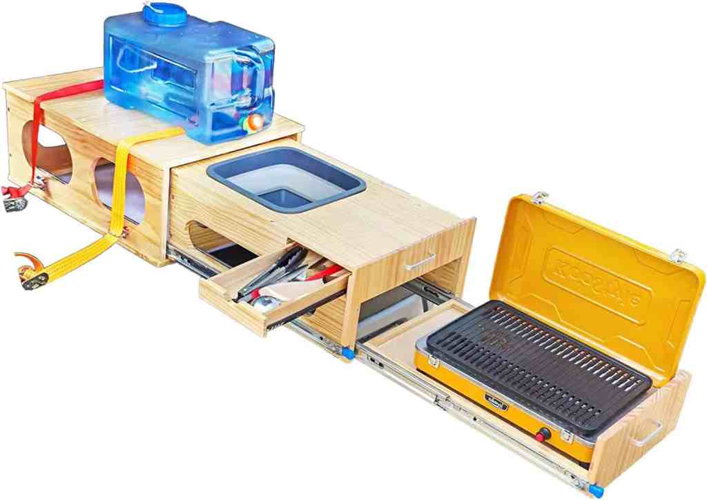 Easy slide in and out all in one construction. Save on space while at the same time providing a quick pull out kitchen. Setup in seconds. This pull out kitchen unit can fit in a camper van, camper, SUV or small car.
