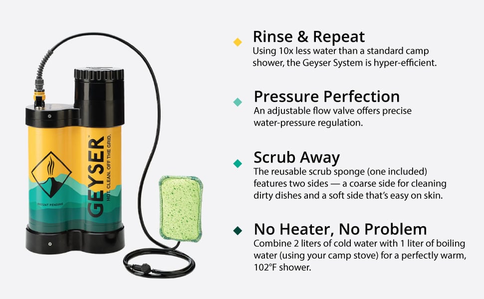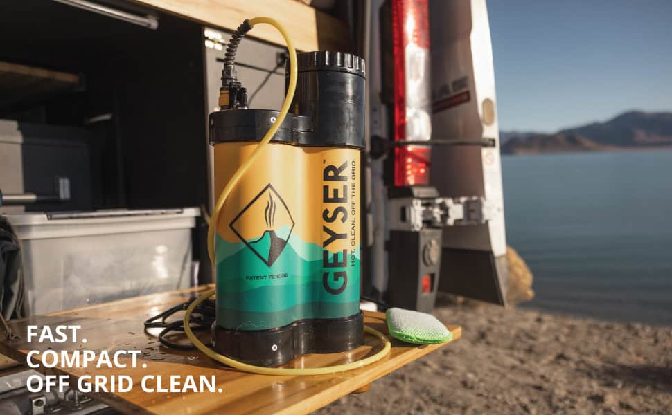 The Geyser System is a compact, portable, and efficient water heating solution designed for van lifers and outdoor enthusiasts. It’s engineered to provide a hot shower using a minimal amount of water, making it perfect for off-grid adventures. The system includes a heating unit, a pump, and a reusable scrub sponge with a built-in water dispensing feature.