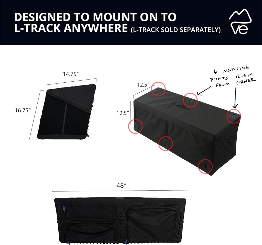 Measuring 48” wide, 16” tall, and 14” deep, the cabinet fits neatly overhead, creating instant usable storage space without sacrificing headroom. To ensure a secure fit, install your L-track (not included) 12.5” from the corner of your van. This setup allows the cabinet to mount perfectly for both function and aesthetics.