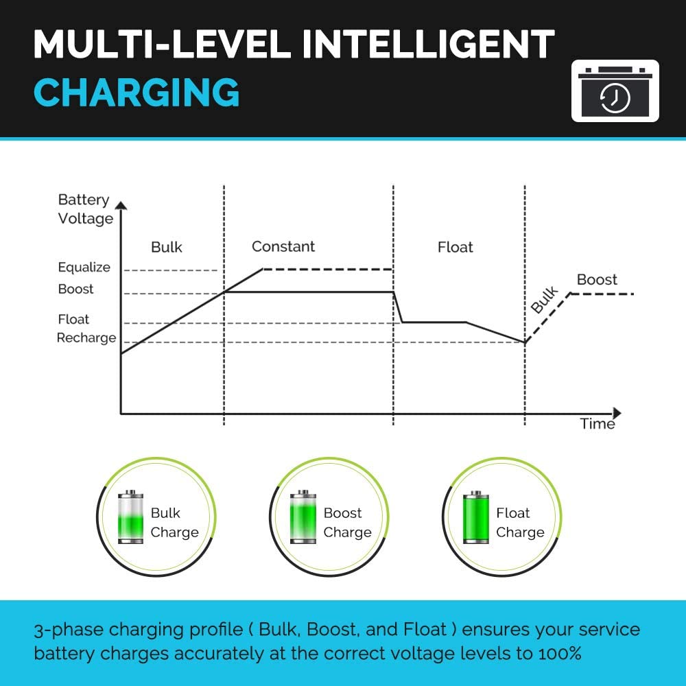- Sophisticated automatic 3-phase charging profile (Bulk, Boost, and Float) ensures your service battery will accurately charge at the correct voltage levels to 100%