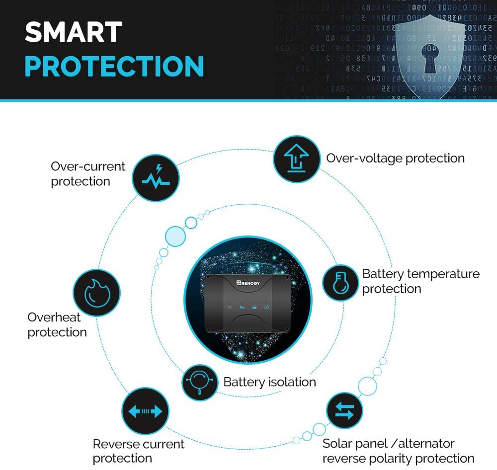 - Smart Protection Features: battery isolation, over-voltage protection, battery temperature protection, over-current protection, overheat protection, reverse current protection, solar panel and alternator reverse polarity protection